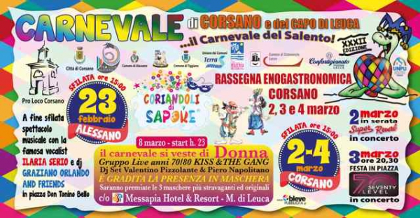 I festeggiamenti si aprono il 23 febbraio ad Alessano, con la grande sfilata, con la vocalist Valentina Serio e Dj Graziano Orlando and Friends. Il 2 marzo carri sfileranno a Corsano con concerto finale dei "Super Reverb". Il 3 marzo apriranno le danze con la strabordante energia i "Seventy level" con un repertorio di musica dance 70/80'. Il 4 marzo sfilata per le vie del paese. L'8 marzo invece, festa in maschera presso il Messapia Resort di Leuca.